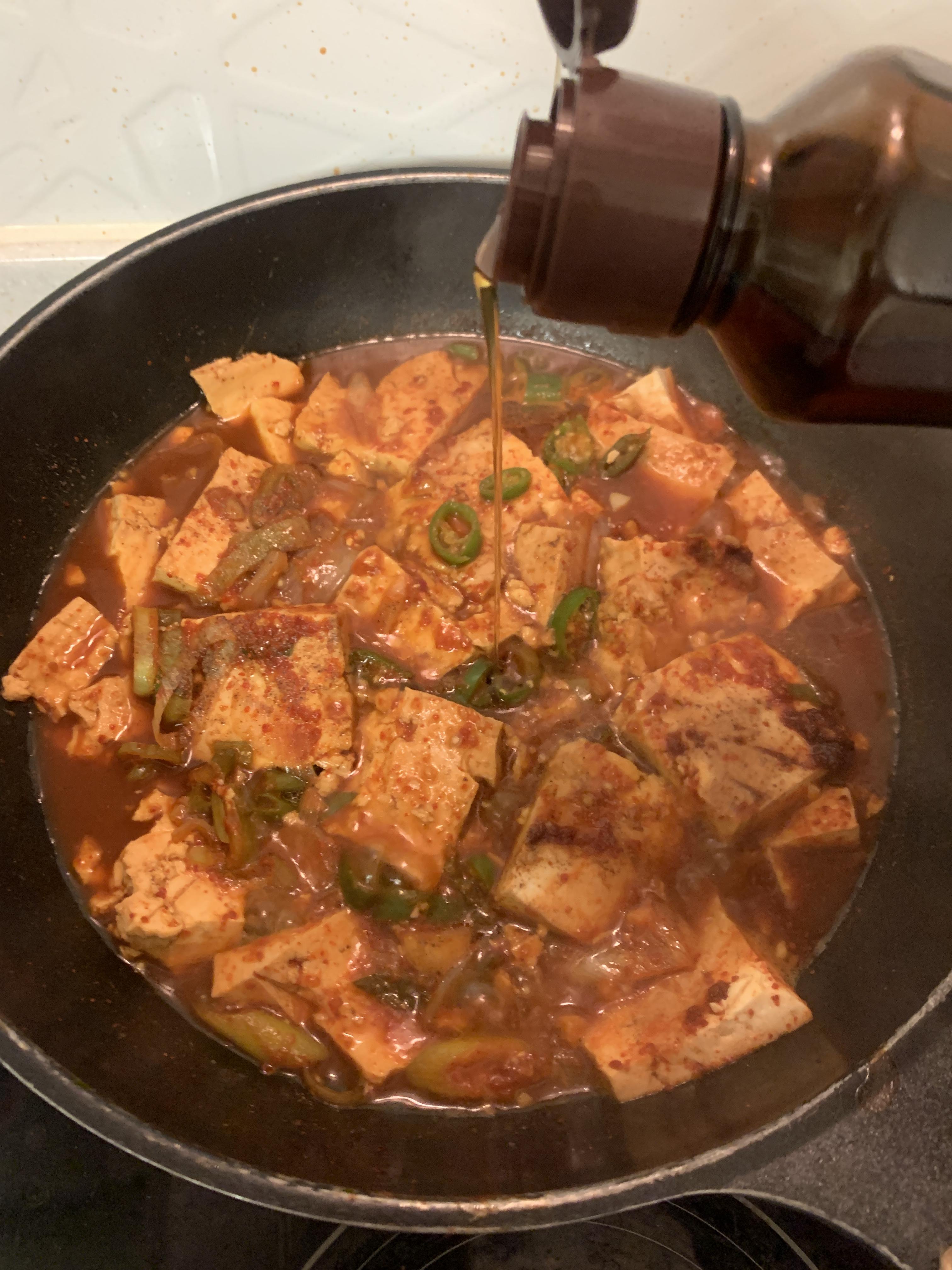 재료: 두부, 양파, 대파, 다진마늘, 고춧가루, 간장, 설탕, 참기름