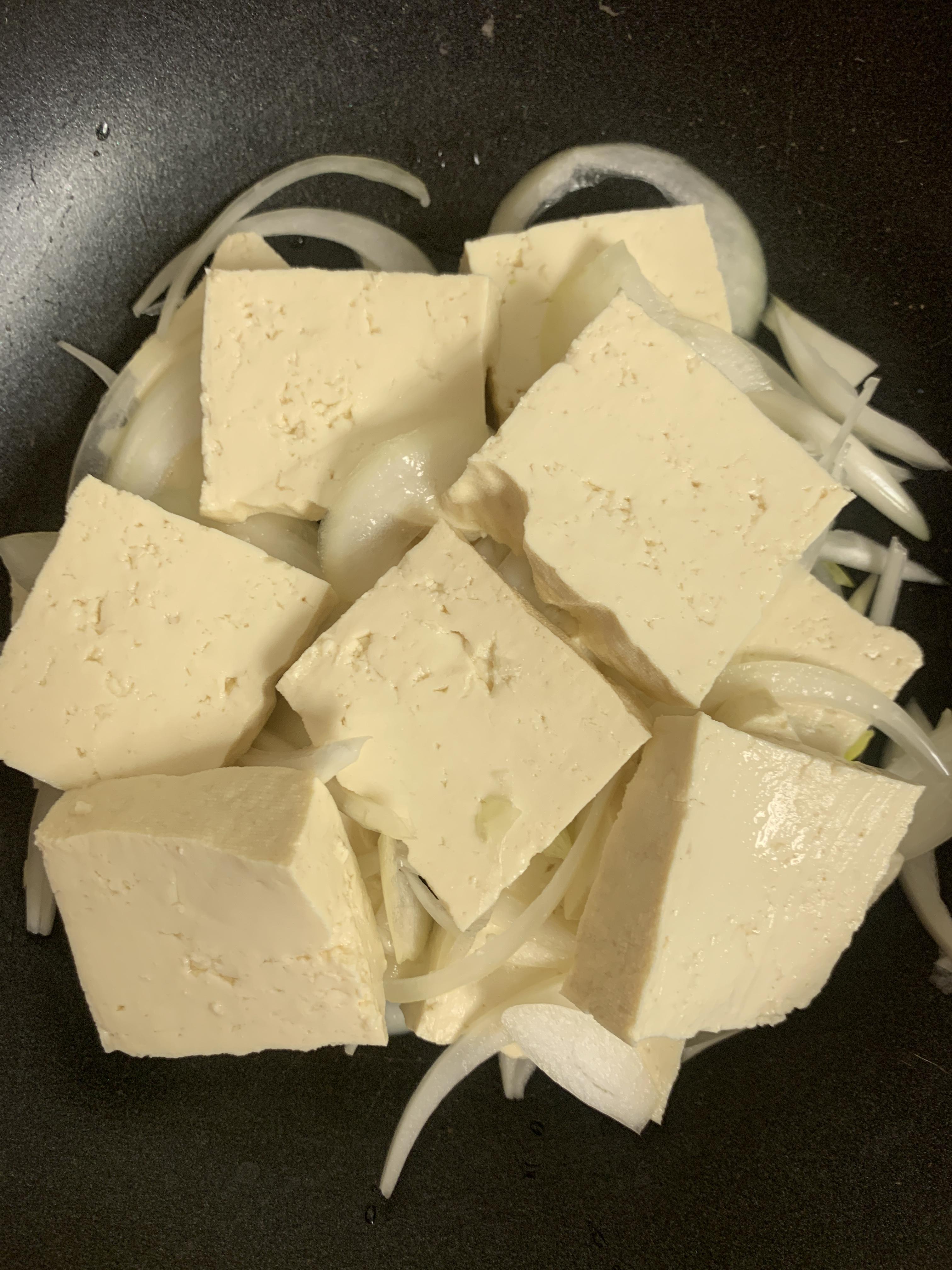 1. 두부를 네모지게 썰어주고, 양파->두부->양파->두부 순으로 번갈아 깔아줬어요.