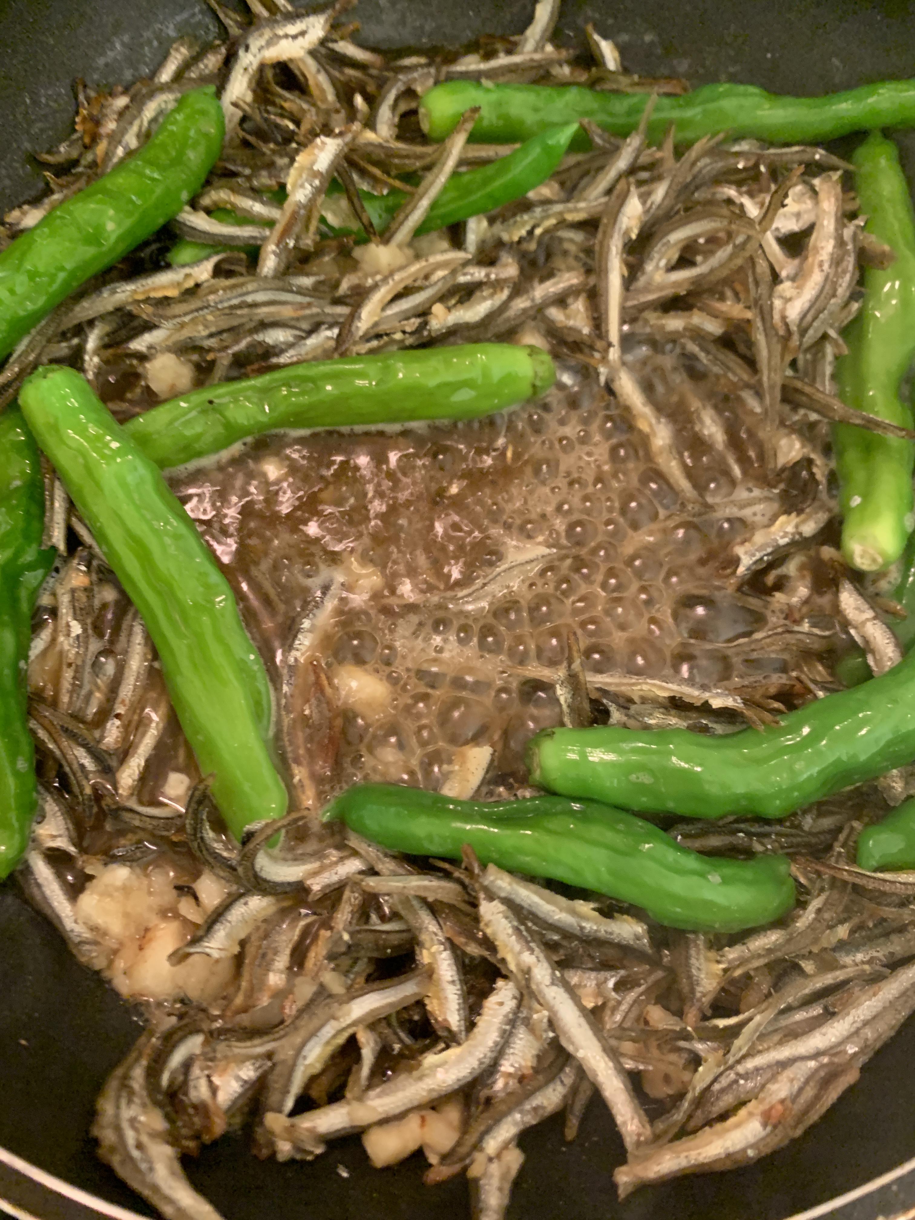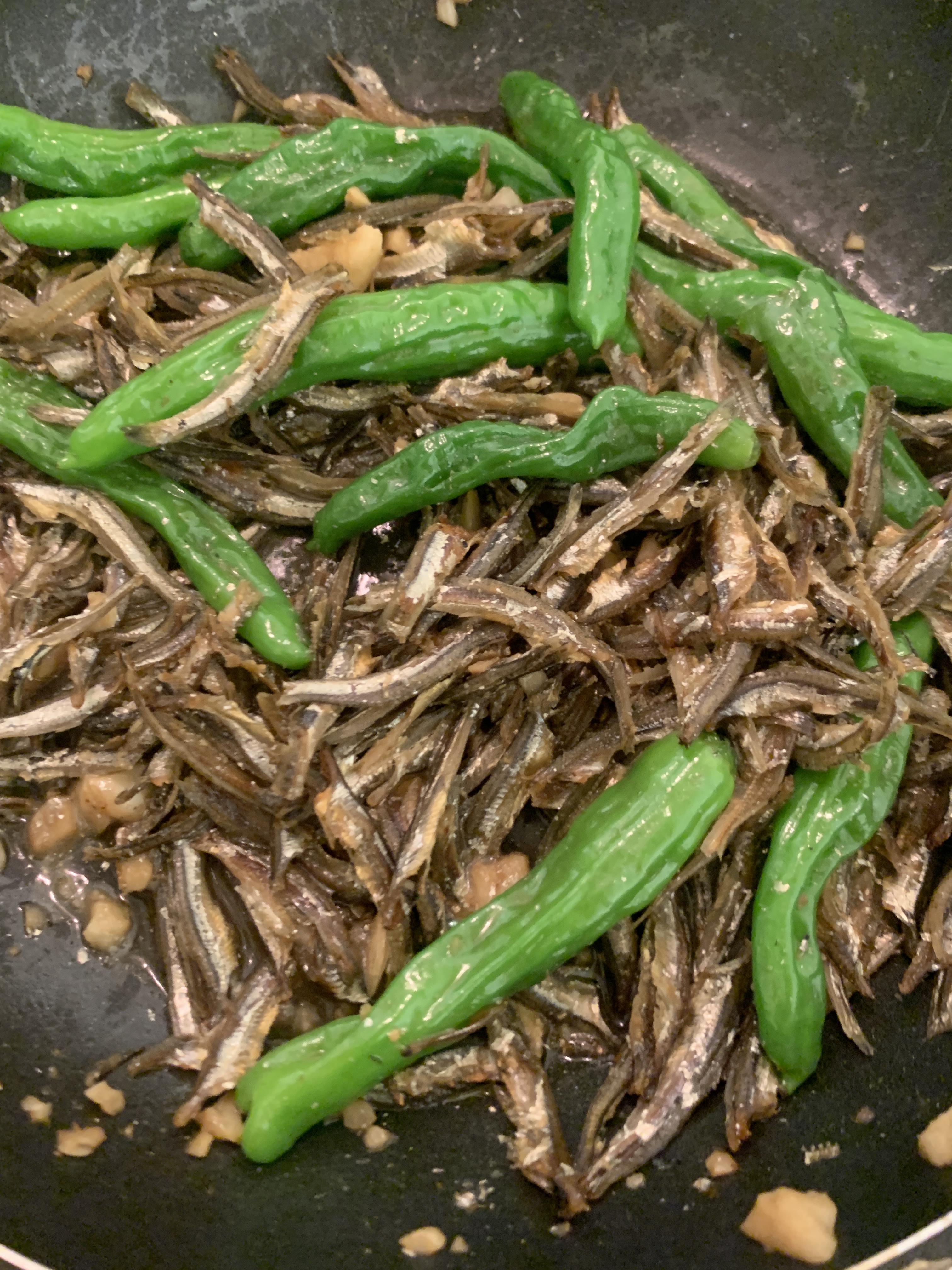 2. 멸치가 좀 바싹해 보이면 다진마늘, 꽈리고추를 넣어 볶아줍니다.