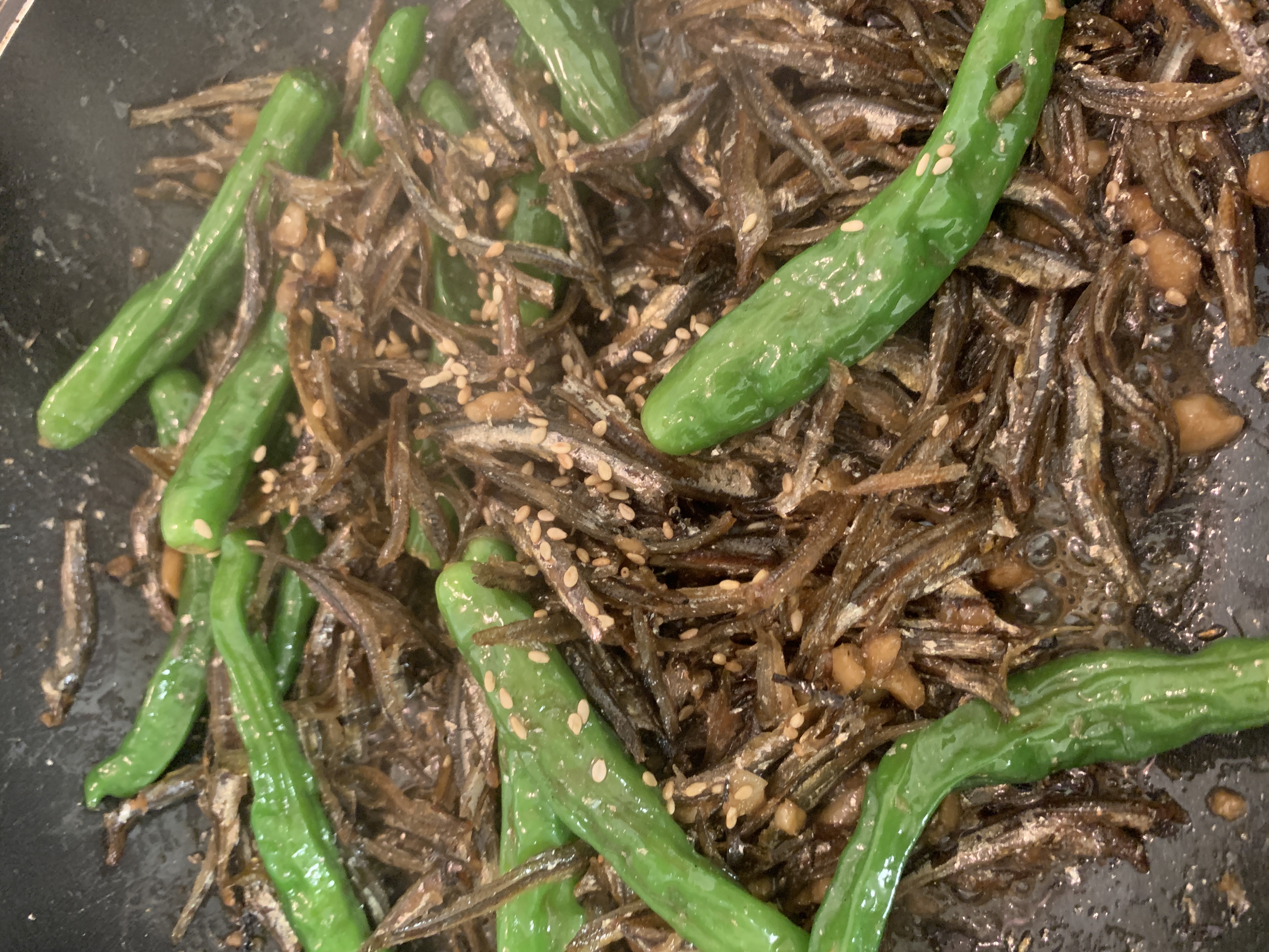 재료: 마른 멸치, 꽈리고추, 다진마늘, 간장, 올리고당, 깨